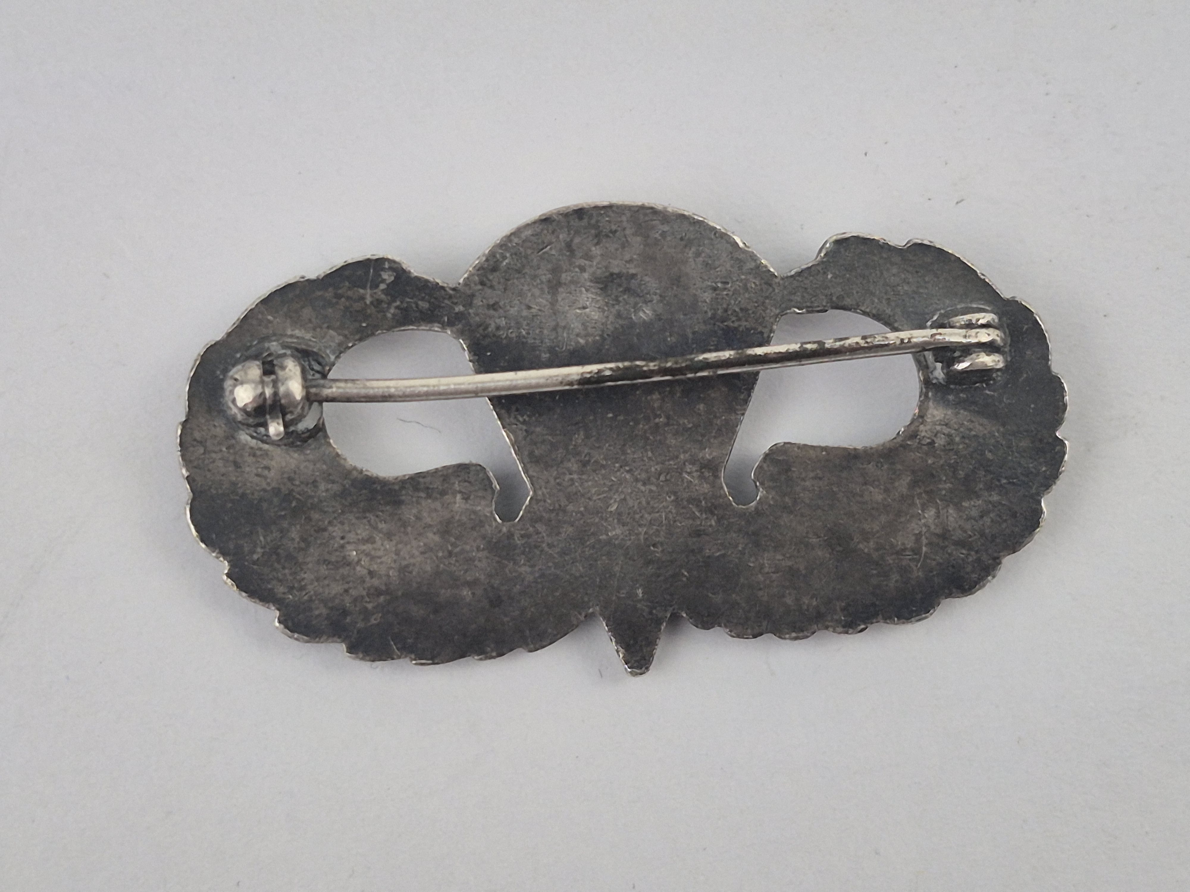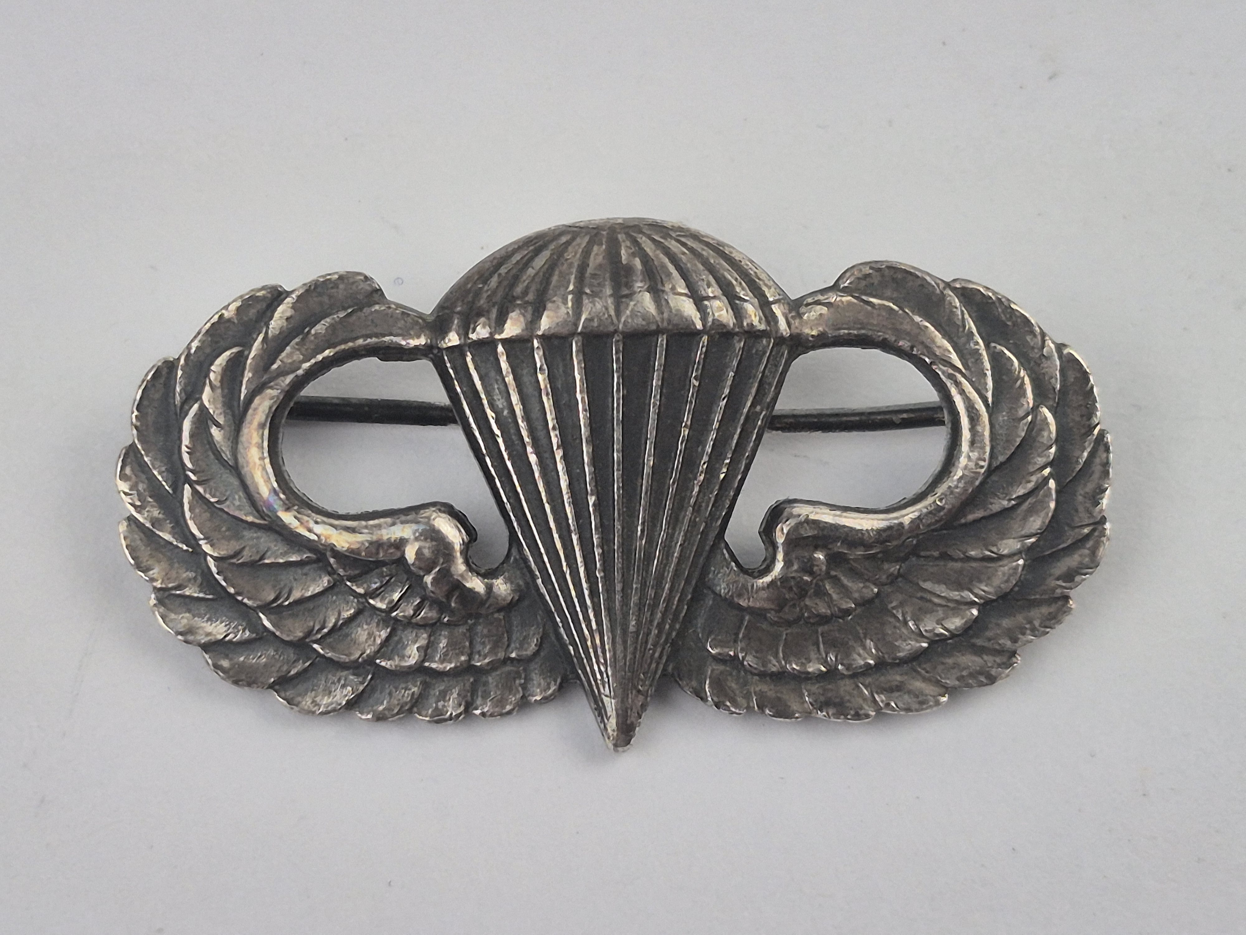 Brevet de parachutiste USMM-1709Brevet de parachutiste US. Se porte sur la poitrine de la tenue de sortie ou parfois sur la veste de saut. Modèle de fabrication à épingle (fonctionnelle). Créé par le Captain Yarborough et le 2nd Lieutenant Minter, ce brevet, qui sera remis pour la première fois le 23 mars 1941, est destiné au soldat qualifié parachutiste après avoir effectué six, puis cinq sauts. |
